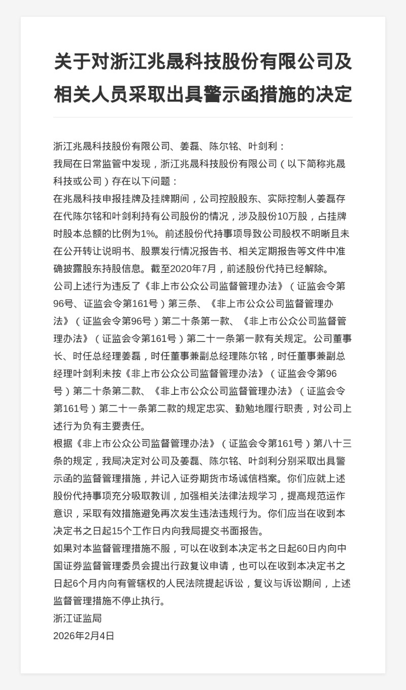对此,浙江证监局决定对浙江兆晟科技股份有限公司及姜磊、陈尔铭、叶剑利分别采取出具警示函的监督管理措施,并记入证券期货市场诚信档案。