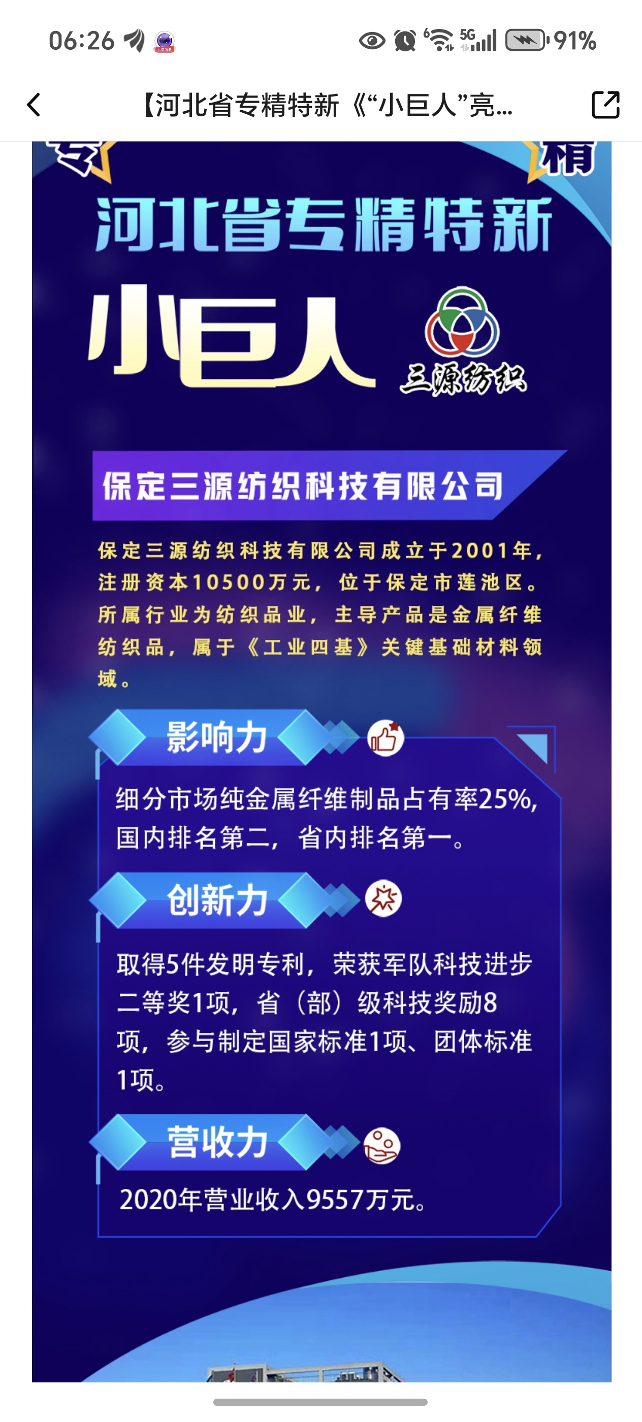 三源纺织在创立之始就确立了“主动创新”战略,把全部精力用在研发、生产,防静电、防电磁辐射、阻燃、耐高温等产业用纺织品上,创建了国内首条纯金属纤维纺织生产线。
