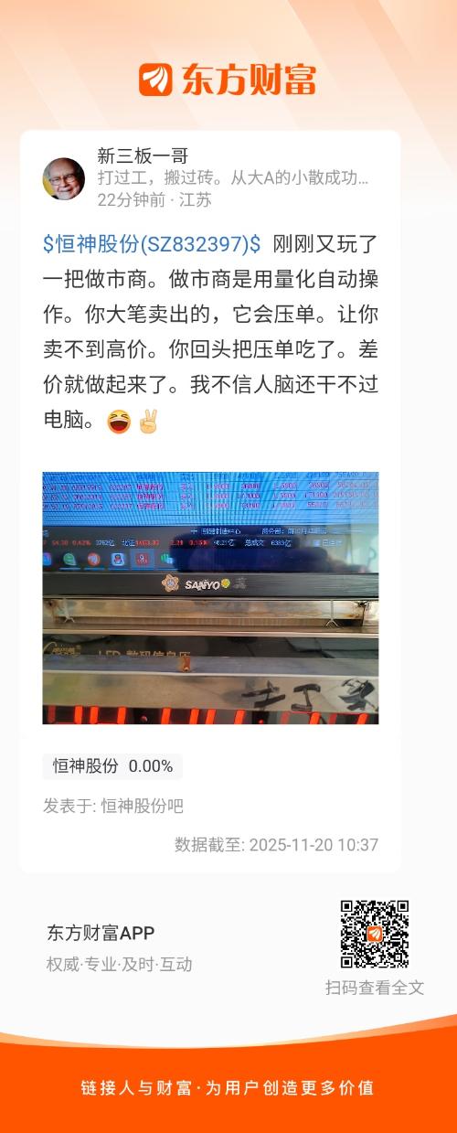 $恒神股份(SZ832397)$ 刚刚又玩了一把做市商。做市商是用量化自动操作。你大笔卖出的,它会压单。让你卖不到高价。你回头把压单吃了。差价就做起来了。我不信人脑还干不过电脑。