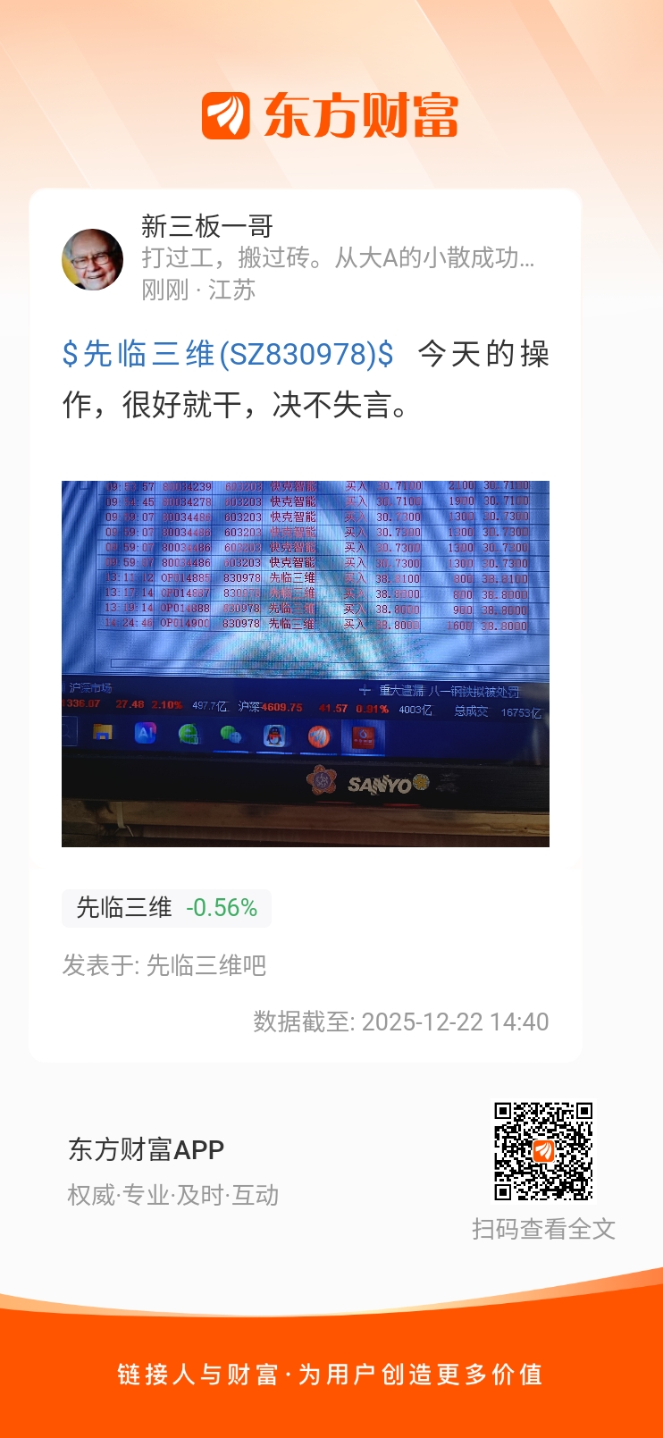 $先临三维(SZ830978)$  今天的操作,很好就干,决不失言。