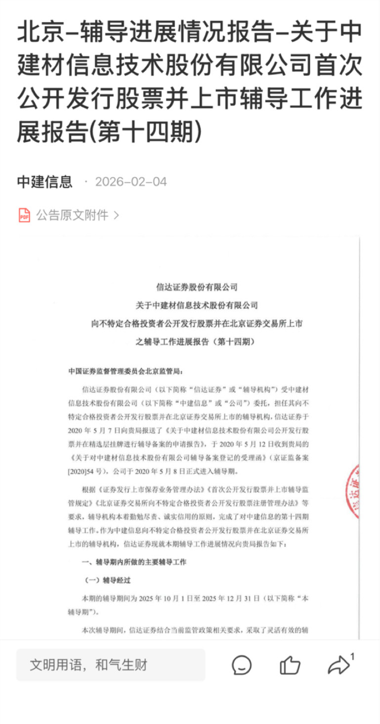 $中建信息(SZ834082)$ 14期进展发布, 利好来了,辅导进展正常进行,明确了中信接手