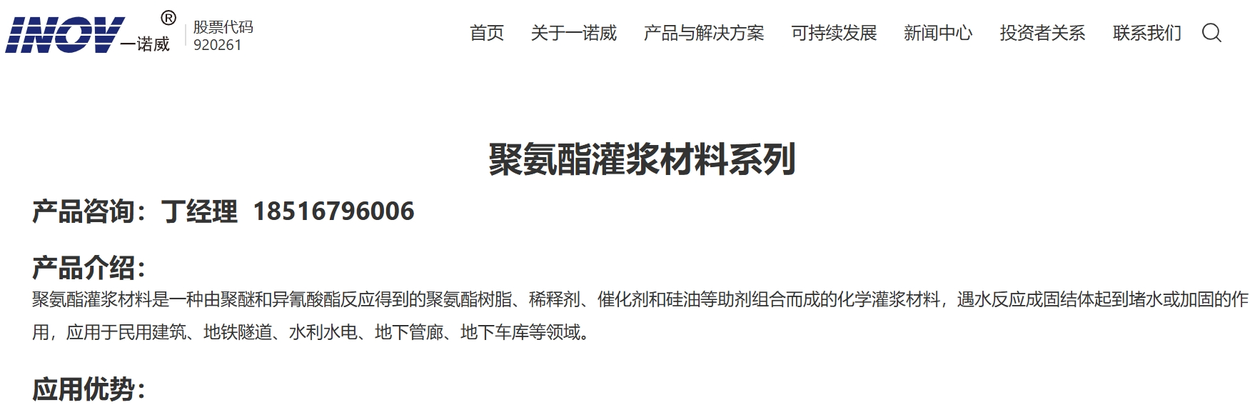 聚氨酯灌浆材料是一种由聚醚和异氰酸酯反应得到的聚氨酯树脂、稀释剂、催化剂和硅油等助剂组合而成的化学灌浆材料,遇水反应成固结体起到堵水或加固的作用,应用于民用建筑、地铁隧道、水利水电、地下管廊、地下车库等领域。
