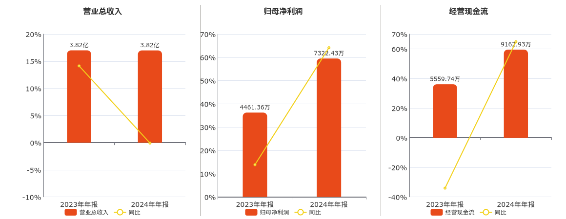 公司营业总收入为3.82亿元,在已披露的同业公司中排名第52,较去年同报告期营业总收入减少31.75万元,同比较去年同期下降0.08%。归母净利润为7322.43万元,在已披露的同业公司中排名第32。经营活动现金净流入为9162.93万元,在已披露的同业公司中排名第31。