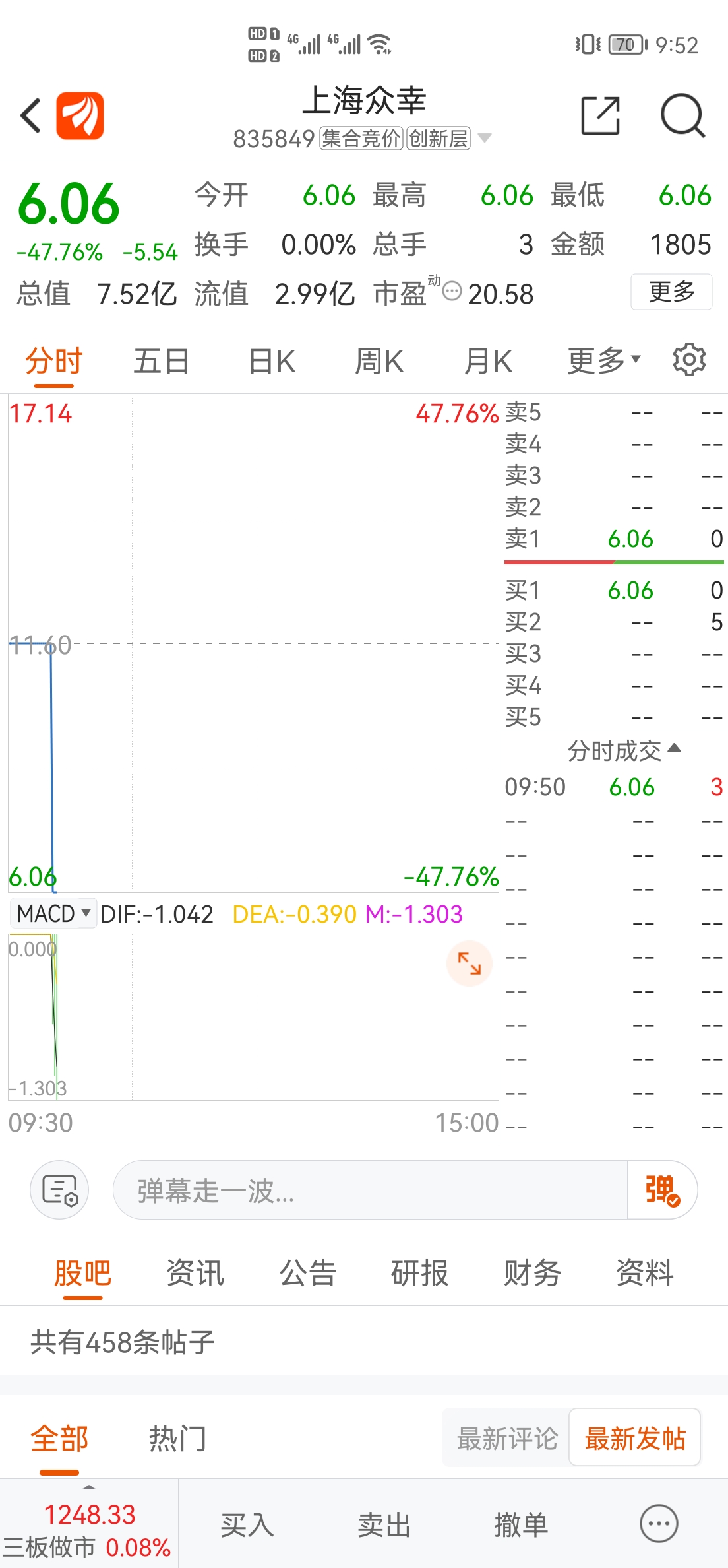 上海众幸开启价值回归:成交3手,成交价6.06元。