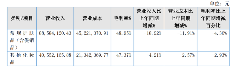 按产品分类,常规护肤品(含促销品)在2024年实现营业收入8858.4万元,同比下滑18.92%,毛利率同比减少4.3%至48.95%;其他化妆品营业收入同比下滑4.21%至4055.2万元,毛利率较上年同期减少2.93%至47.37%。