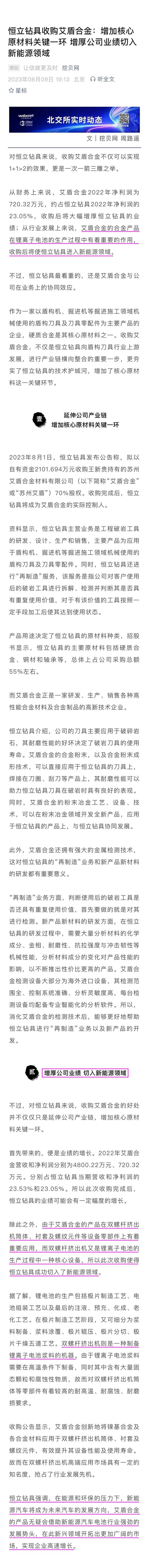 恒立钻具收购艾盾合金:增加核心原材料关键一环 增厚公司业绩切入新能源(动力电池)领域