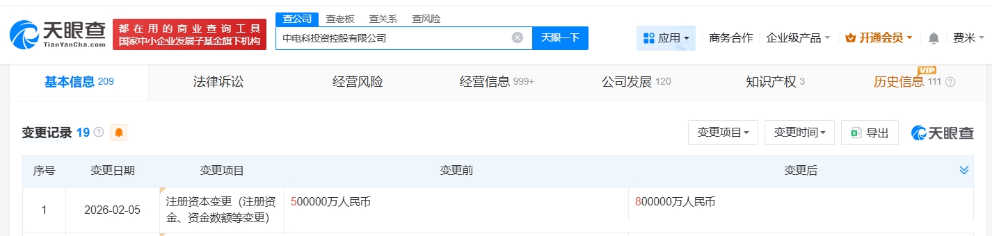 南方财经2月9日电,天眼查App显示,近日,中电科投资控股有限公司发生工商变更,注册资本由50亿人民币增至80亿人民币,增幅60%。该公司成立于2014年4月,法定代表人为靳彦彬,经营范围为投资管理、股权投资、投资咨询、产权经纪,由中国电子科技集团有限公司全资持股。