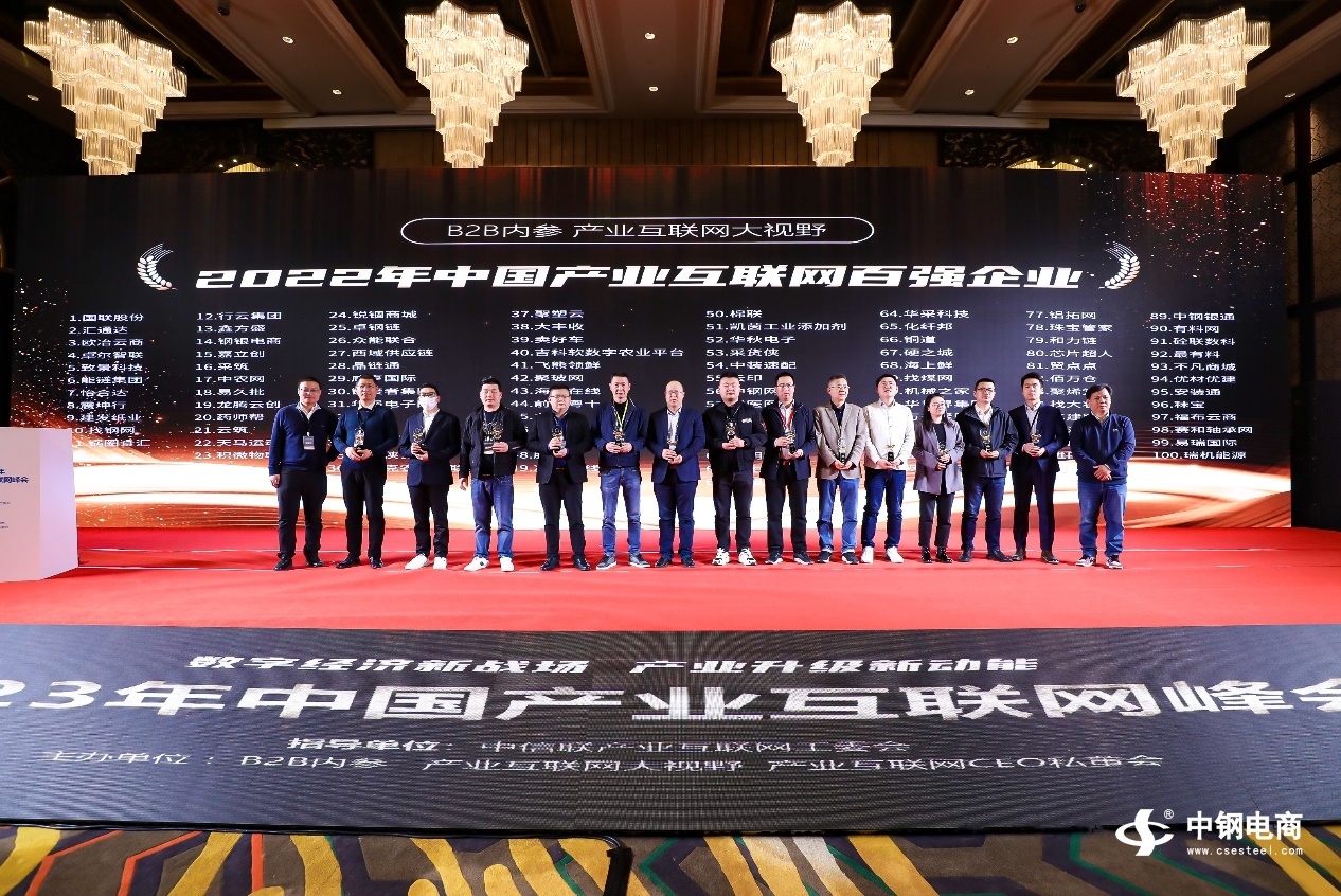 3月16日,由中信联产业互联网工作委员会指导,B2B内参、产业互联网大视野、产业互联网CEO私董会主办的2023年中国产业互联网峰会暨2022年中国产业互联网百强企业颁奖盛典在上海成功召开。大会围绕“数字经济新战场,产业升级新动能”为主题, 全国头部产业互联网平台企业及一线机构代表,巅峰论道。大会上《2022年中国产业互联网百强企业》榜单正式公布,中钢电商成功入选。