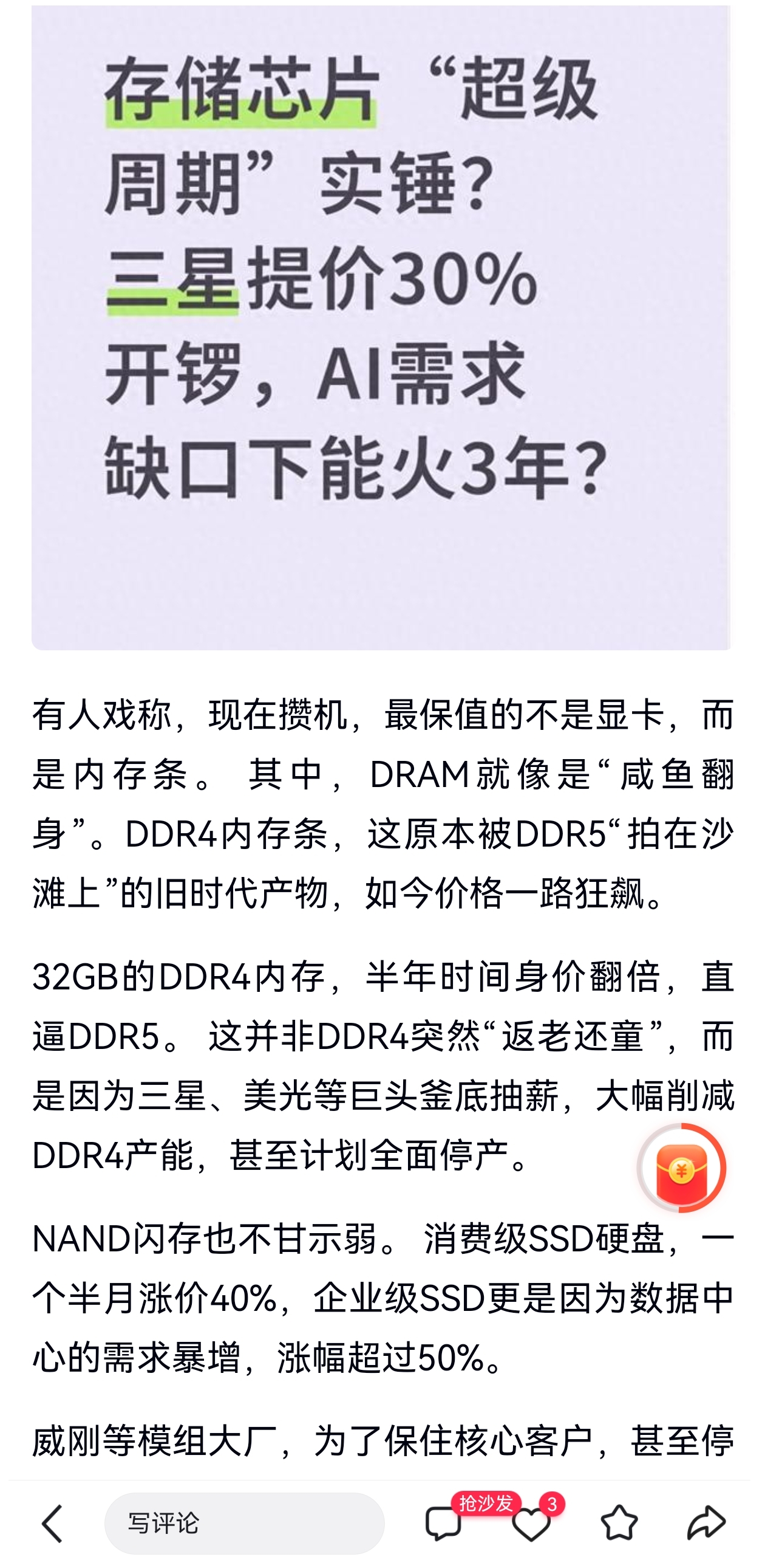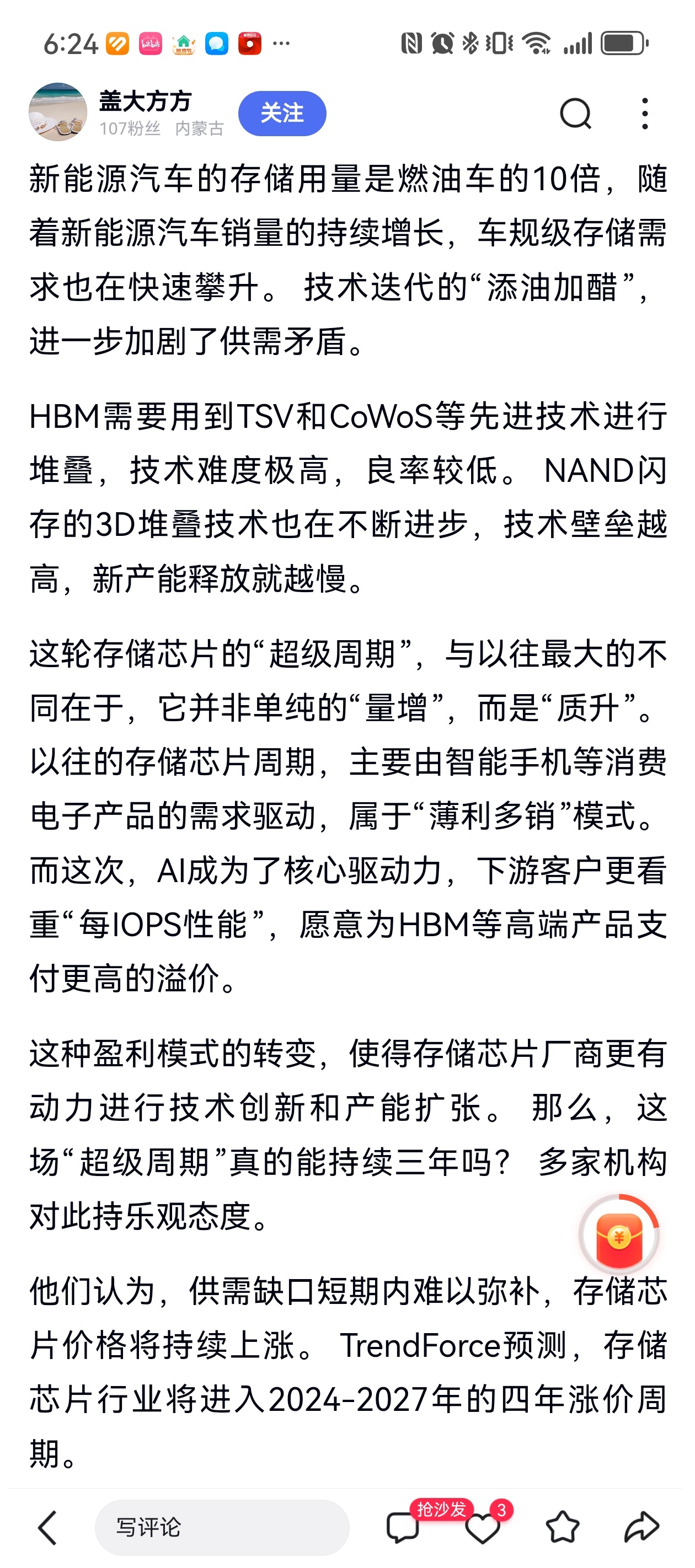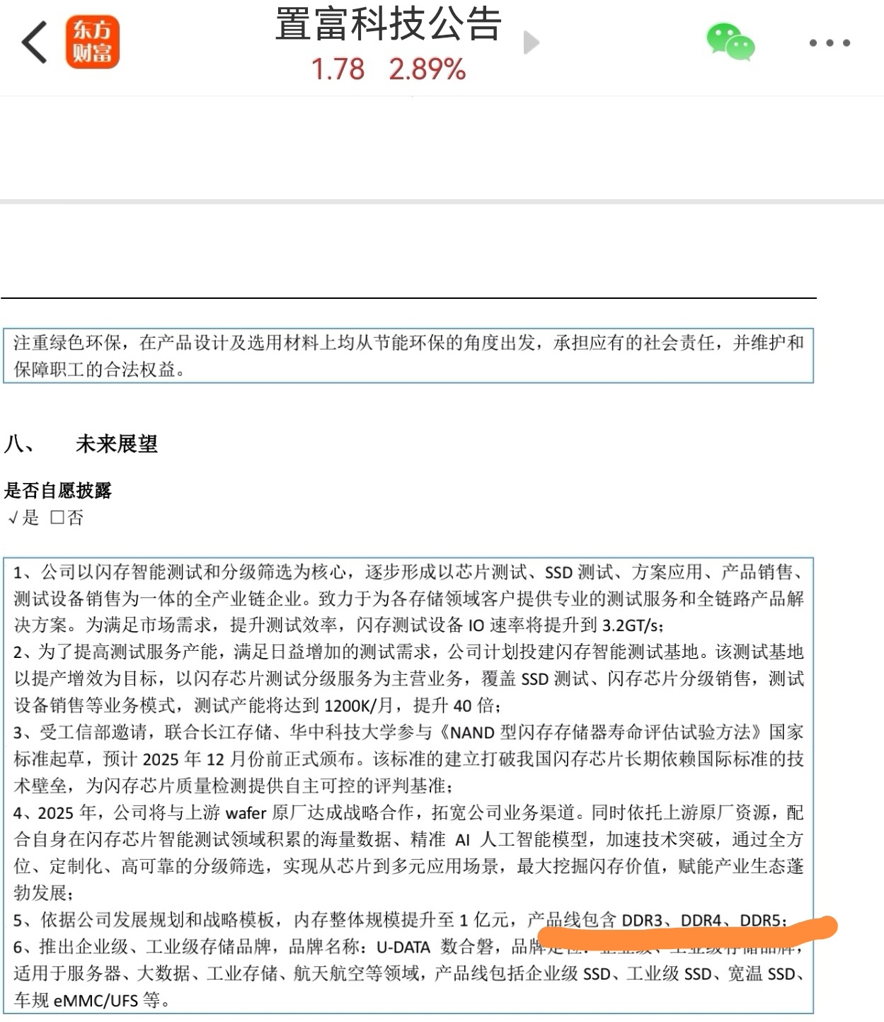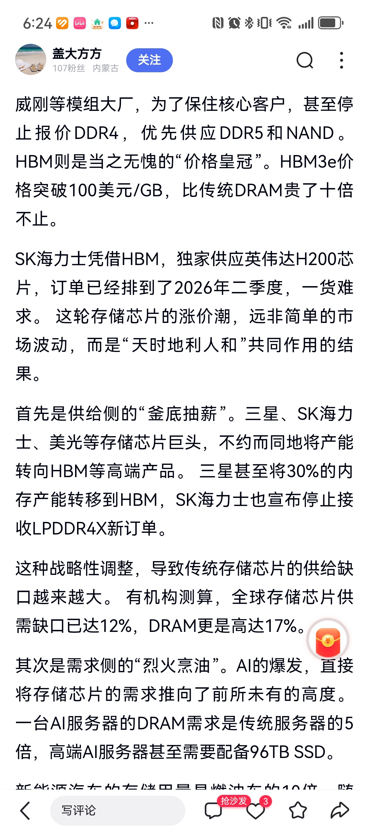 $置富科技(SZ838696)$ $恒宝通(SZ832449)$ $蓝耘科技(SZ871169)$ DDR4今年价格暴涨5倍,置富科技有产品线,存储产业进入长期繁荣趋势信号明显。三星,美光几乎所有产线转移至HBM,DDR5, 未来ddr4产能缺口也将继续拉大。存储巨头拥抱奥特曼放弃全世界。存储芯片新产能扩产一般要3年才能投产,未来存储产业有望迎来史诗级的趋势行情。备注警告:投资有风险,操作需谨慎!