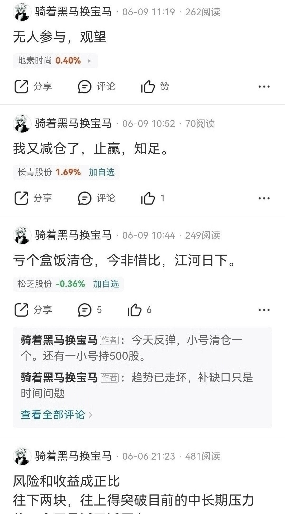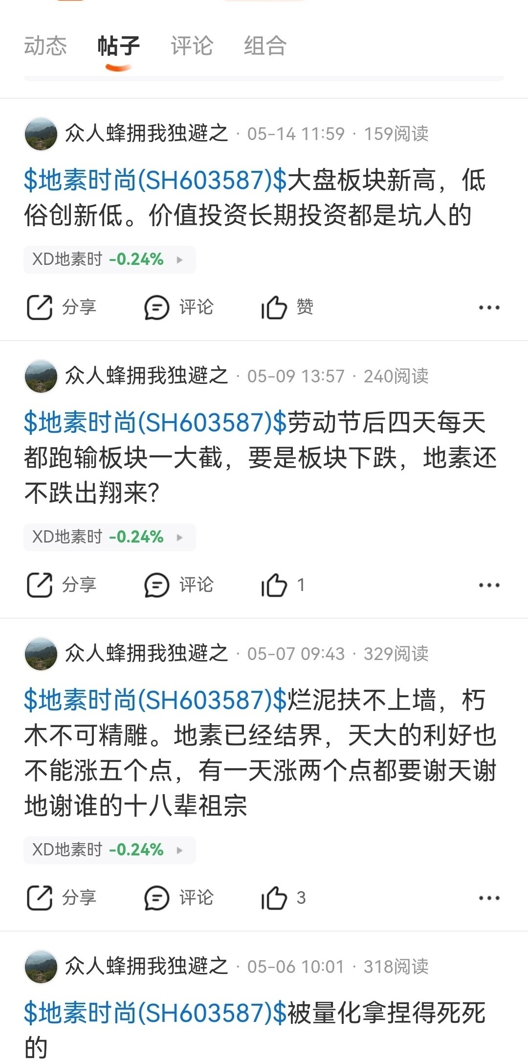 $星星服装(SZ870877)$ $地素时尚(SH603587)$ 绩优股业绩在服装板块中优秀顶尖,相对于服装板块补涨翻倍,季线底部中长线至少十倍涨幅,去年九月十元附近北向资金清仓踏空,今年六月加入沪港通才可以买,北向托又出来唱空攻击人没有必要,破坏投资环境坚决抵制打击这种行为