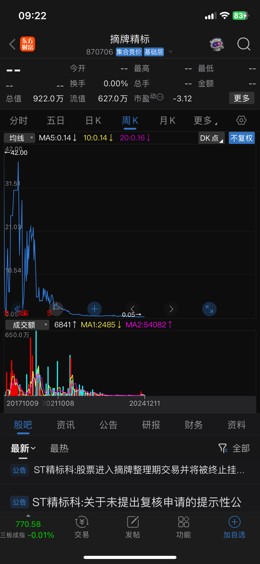 $ST蒂艾斯(SZ872099)$ 看了财报资产负债率120%,属于严重资不抵债,所以st了,后续大概率会摘牌退市,新三板基础层有高度st后期报漏跌成几分钱,看看870706摘牌精标,从高点42跌到9分。风险很大。建议远离。