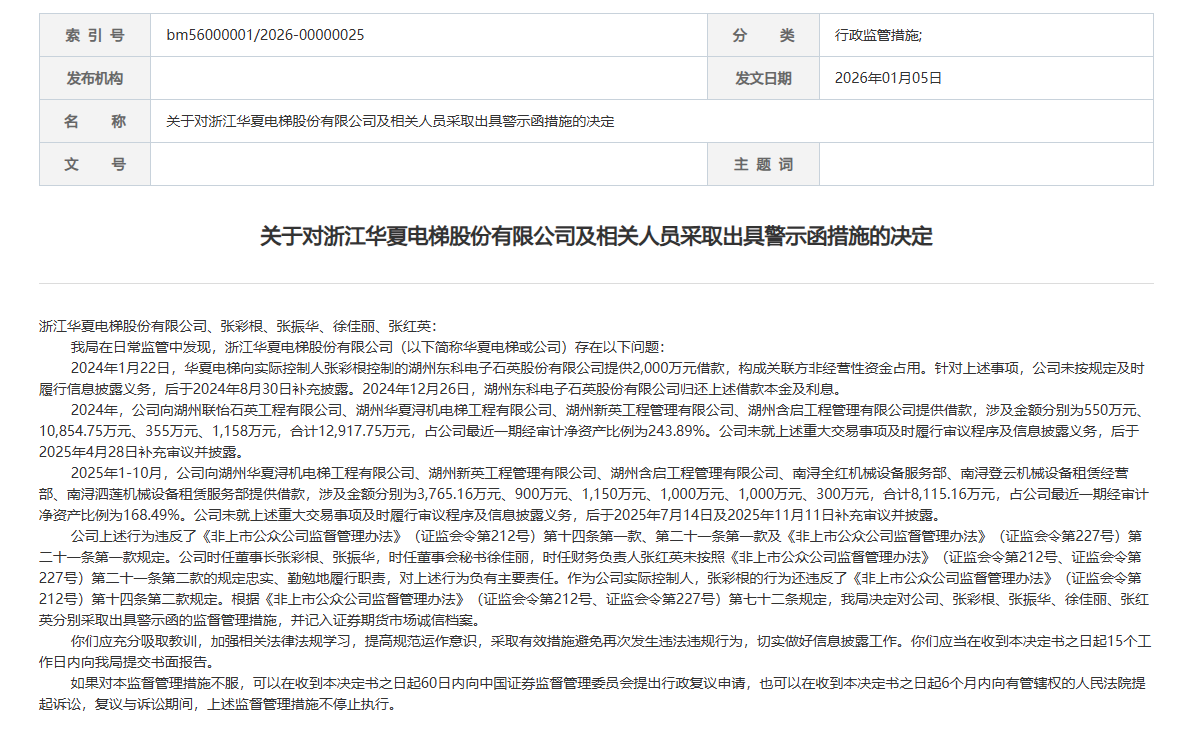 1月5日,浙江证监局发布公告,浙江华夏电梯股份有限公司及其相关人员张彩根、张振华、徐佳丽和张红英收到了出具警示函的监督管理措施。