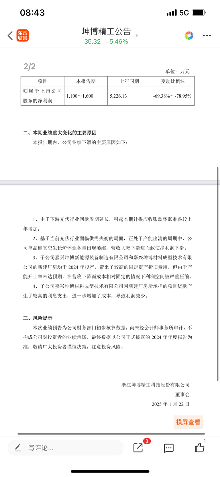 $坤博精工(SZ873570)$ 1月22日早就有业绩预告了。在利润在预告之间正常,没有什么大惊小怪的。主要还是受到光伏的影响。现在光伏版块正在底部,产能正在慢慢出清,等待反转