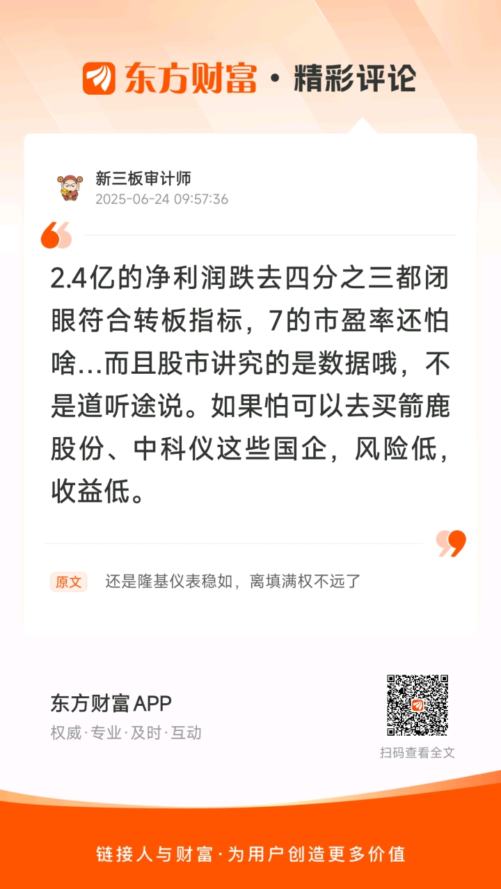 估值低总是有理由的。。。//@新三板审计师 :2.4亿的净利润跌去四分之三都闭眼符合转板指标,7的市盈率还怕啥…而且股市讲究的是数据哦,不是道听途说。如果怕可以去买箭鹿股份、中科仪这些国企,风险低,收益低。
