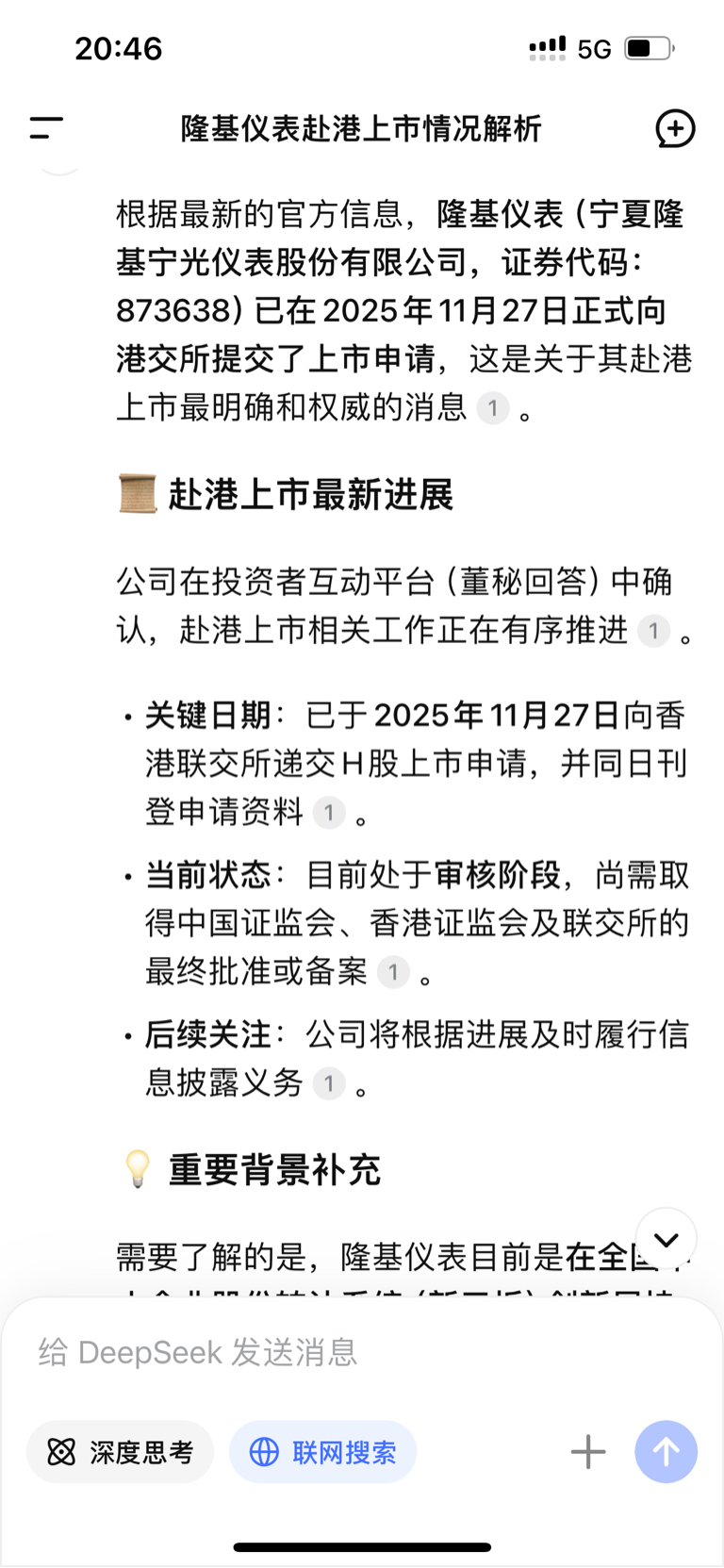 DeepSeek说隆基仪表2025年11月27日向港交所提交了上市申请