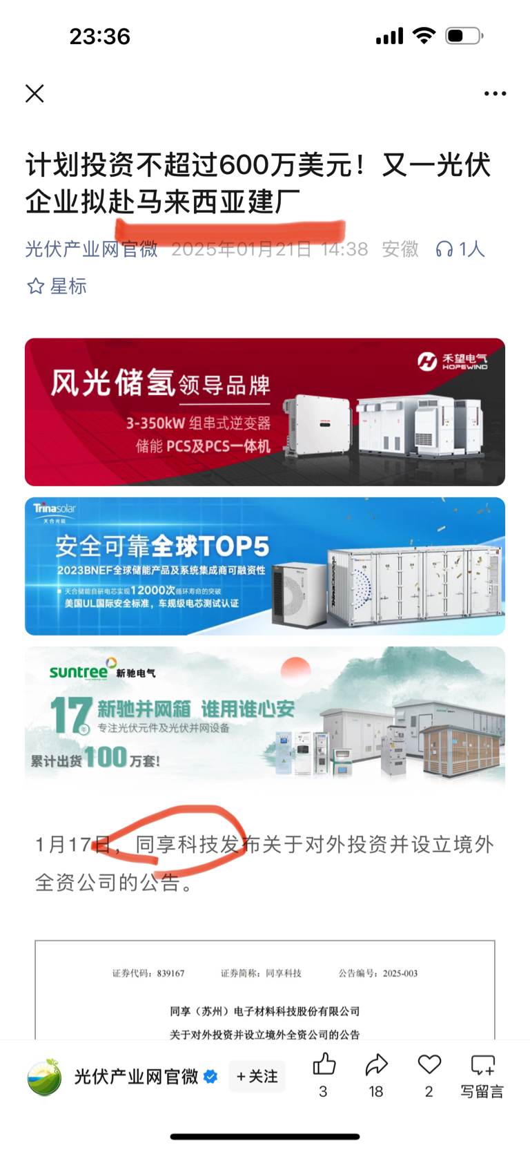 同享科技(BJ839167) 马来西亚建厂,光伏出海。