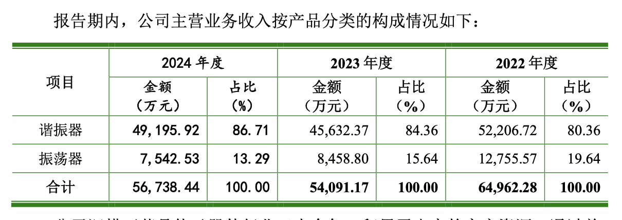 鸿星科技的业务结构较为单一。2022年至2024年间,谐振器的营收占比分别为80.36%、84.36%和86.71%,而振荡器的营收占比最高也不过19.64%,2024年更是只有13.29%。这种业务结构使得公司抗风险能力较弱。