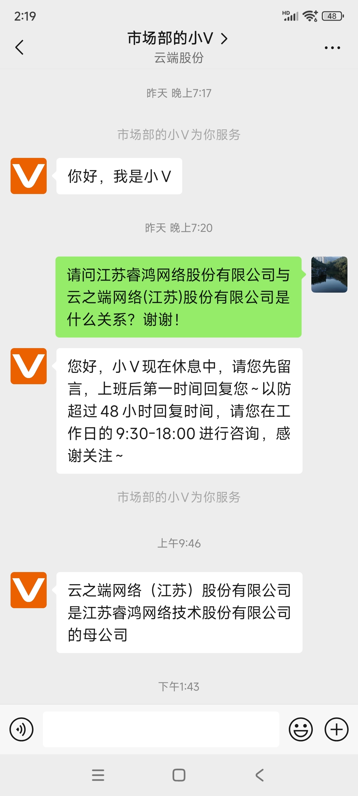 $睿鸿股份(SZ873920)$ 确认了云之端网络(江苏)股份有限公司是睿鸿网络股份有限公司母公司!