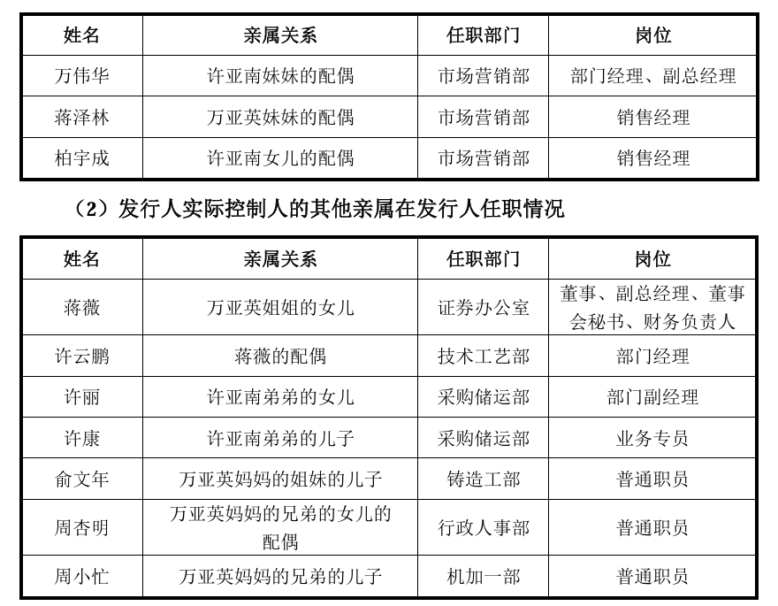 此外,北交所关注到,凯达重工实控人多名亲属在公司任职。其中,万亚英姐姐的女儿蒋薇任公司董事、副总经理、董事会秘书、财务负责人;许亚南妹妹的配偶万伟华任公司部门经理、副总经理;万亚英妹妹的配偶蒋泽林任公司销售经理。