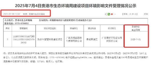 贵港市生态环境局2025年7月4日发布的公示显示,百菲乳业申请的“奶水牛智慧牧场建设项目环境影响文件”获受理,承诺办结截止日期是“2025年7月31日”。
