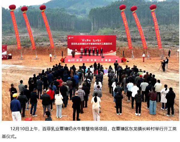 贵港市委宣传部官方微信公众号“贵港宣传”2024年12月发布消息显示,百菲乳业奶水牛智慧牧场项目12月10日上午举行开工奠基仪式。
