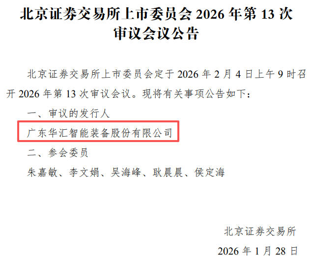 1月28日晚间,北交所官网显示,广东华汇智能装备股份有限公司(简称“华汇智能”)将于2月4日上会迎考。