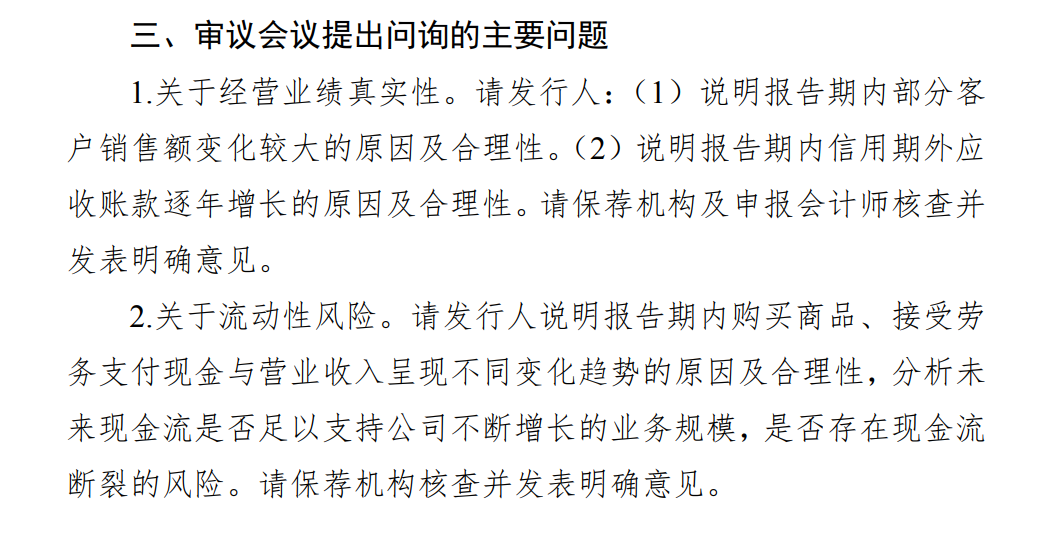 此前,监管曾将问询焦点聚焦于报告期内信用期外应收账款逐年增长的原因及合理性。在此次的审议会议上,北交所也就现金流方面的问题提出疑问,要求保荐机构核查分析未来现金流是否足以支持公司不断增长的业务规模,是否存在现金流断裂的风险。