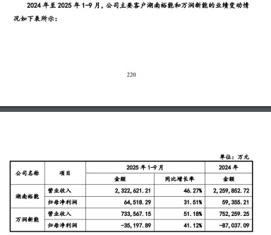 招股书显示,报告期(2022年、2023年、2024年、2025年1-9月)各期前五大客户销售收入占比分别为98.57%、98.89%、96.90%和97.41%,其中第一大客户湖南裕能的销售占比波动剧烈,从2022年的96.79%降至2023年的49.19%,2024年及2025年1-9月又回升至54.33%和78.02%,这一波动也成为监管问询的重点之一。