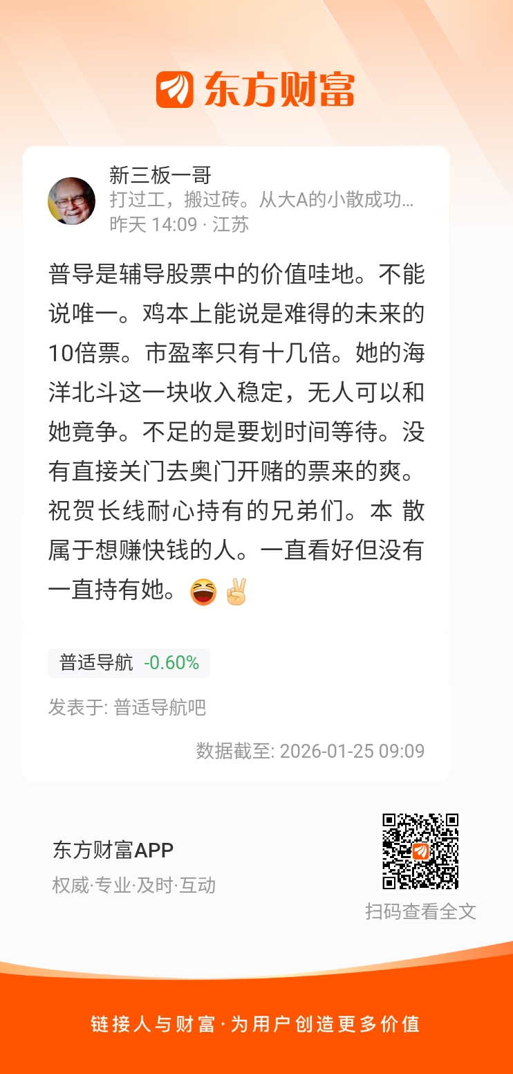 普导是辅导股票中的价值哇地。不能说唯一。鸡本上能说是难得的未来的10倍票。市盈率只有十几倍。她的海洋北斗这一块收入稳定,无人可以和她竟争。不足的是要划时间等待。没有直接关门去奥门开赌的票来的爽。祝贺长线耐心持有的兄弟们。本 散属于想赚快钱的人。一直看好但没有一直持有她。