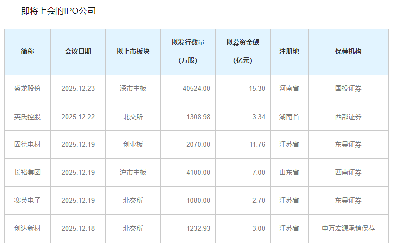 盛龙股份、英氏控股等6家公司IPO即将上会