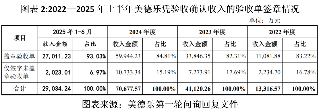 第一轮问询回复文件显示,报告期各期,美德乐以验收单作为收入确认凭证的收入分别为1.33亿元、4.11亿元、7.07亿元、2.90亿元,其中仅签字未盖章验收单的收入分别为0.22亿元、0.73亿元、1.07亿元、0.20亿元,占当期验收确认收入总额的比例分别为16.78%、17.69%、15.19%、6.97%。
