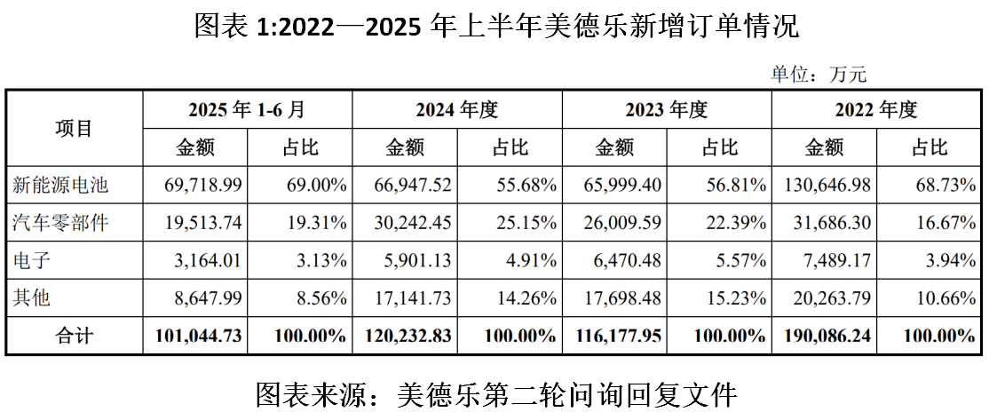 整体来看,报告期内美德乐新增订单也出现缩量。第二轮问询回复文件显示,报告期各期,美德乐新增订单金额分别为19.01亿元、11.62亿元、12.02亿元、10.10亿元。2024年上半年,其新增订单金额为4.66亿元。由此测算,2023—2025年上半年,其新增订单金额同比增速分别为-38.88%、3.49%、116.64%,2022—2024年的复合增长率为-20.47%,报告期内业绩增长并未伴随订单放量。
