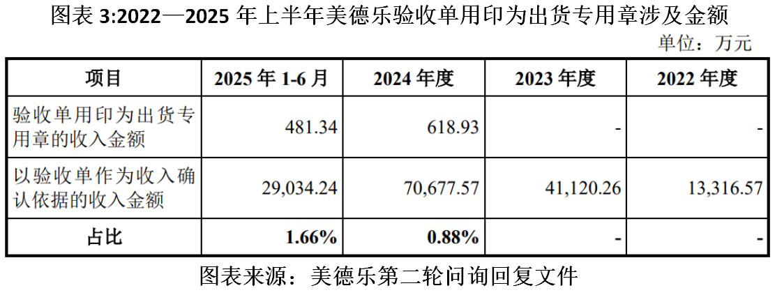 第二轮问询回复文件显示,2024—2025年上半年,美德乐客户验收单用印为出货专用章的收入金额分别为618.93万元、481.34万元,占以验收单作为收入确认依据的收入金额的比例分别为0.88%、1.66%。