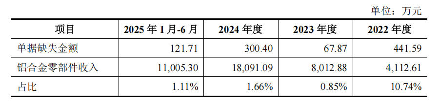 需要注意的是,报告期内,内销直接交付模式下,公司铝合金零部件产品收入确认存在单据缺失的情形。