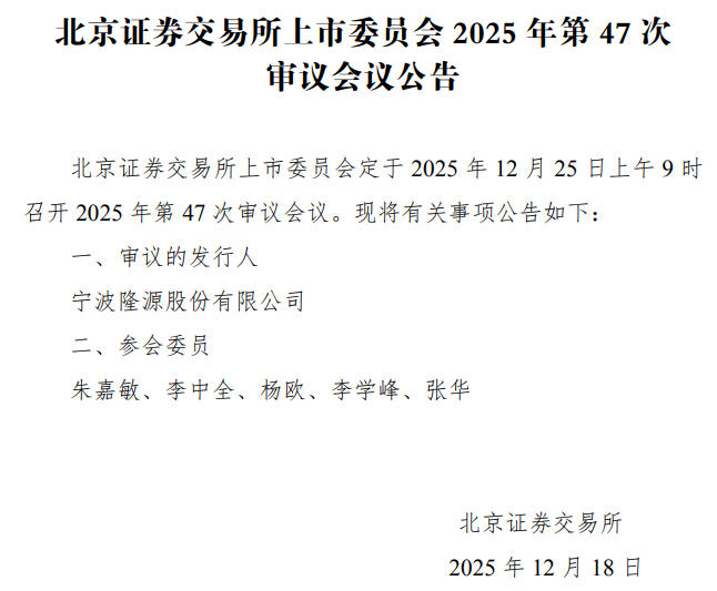 据北交所网站消息,北交所上市委员会定于12月25日召开2025年第47次审议会议,审核宁波隆源股份有限公司(简称“隆源股份”)首发事项。