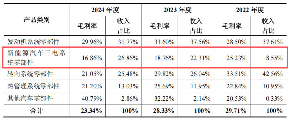 记者发现,核心拖累来自新能源汽车三电系统零部件:该板块收入占比由8.55%升至26.86%,但毛利率却从25.23%大幅下滑至16.86%,出现“放量掉价”的典型特征。