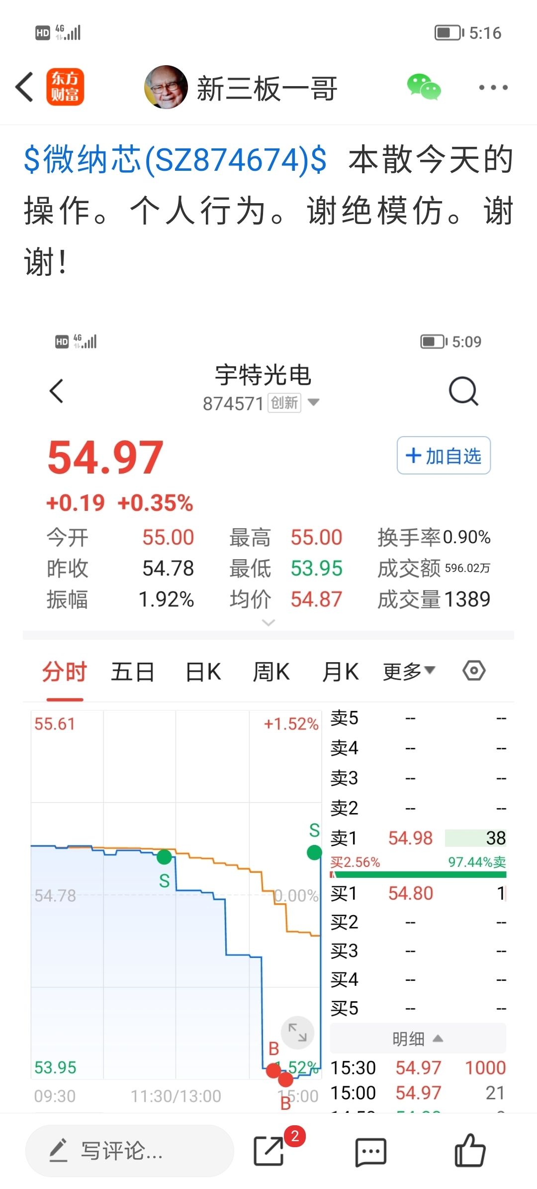 $宇特光电(SZ874571)$ 本散今天的操作,个人行为,谢绝模仿。谢谢!