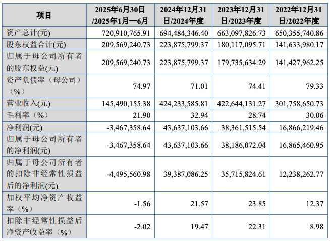 业绩方面,2022年至2024年及2025年上半年(下称报告期),公司营业收入分别为3.02亿元、4.23亿元、4.24亿元和1.45亿元,归母净利润分别为1686.5万元、3818.6万元、4363.7万元和-346.7万元;扣非归母净利润分别为1223.8万元、 3571.6万元、3938.7万元和-449.6万元。