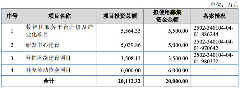 中水三立本次IPO拟募集资金2亿元,其中5500万元用于数智化服务平台升级及产业化项目,5000万元用于研发中心建设,3500万元用于营销网络建设项目,6000万元用于补充流动资金项目。