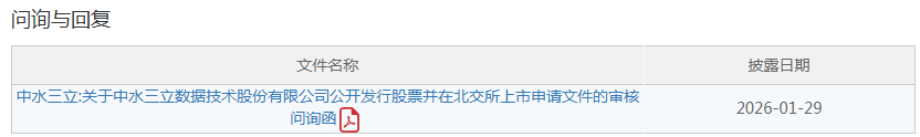 据北交所官网信息,1月29日,北交所对中水三立数据技术股份有限公司(以下简称“中水三立”)IPO申请下发审核问询函,涉及公司股权形成合法合规性、期后经营业绩下滑风险、收入确认准确性、业务模式实质、公司治理有效性、关联交易公允性等问题。