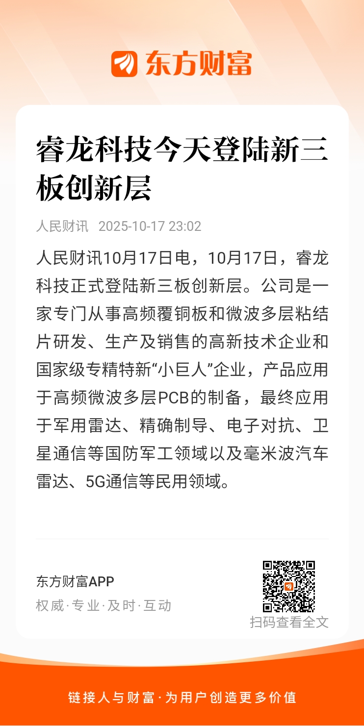 人民财讯10月17日电,10月17日,睿龙科技正式登陆新三板创新层。公司是一家专门从事高频覆铜板和微波多层粘结片研发、生产及销售的高新技术企业和国家级专精特新“小巨人”企业,产品应用于高频微波多层PCB的制备,最终应用于军用雷达、精确制导、电子对抗、卫星通信等国防军工领域以及毫米波汽车雷达、5G通信等民用领域。