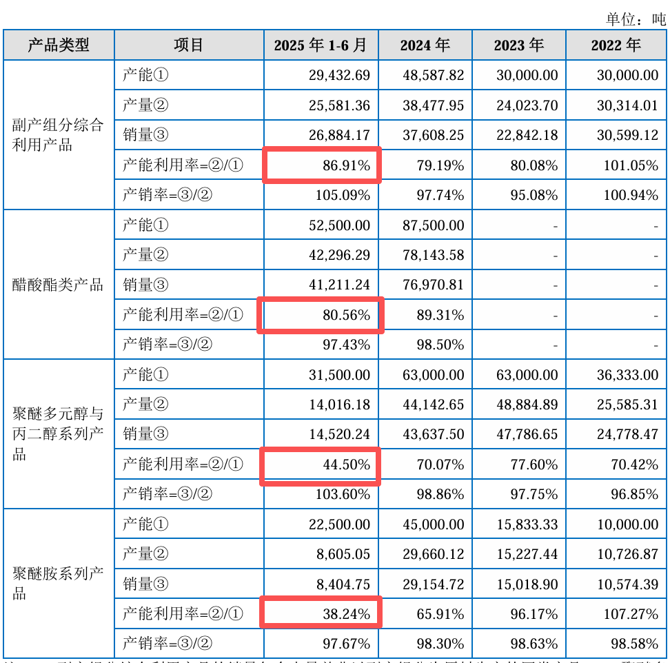 产能方面,2025年上半年,昌德科技多款主要产品的产能利用率均未饱和。公司副产组分综合利用产品、醋酸酯类产品的产能利用率分别为86.91%、80.56%;聚醚多元醇与丙二醇系列产品、聚醚胺系列产品仅44.50%、38.24%。