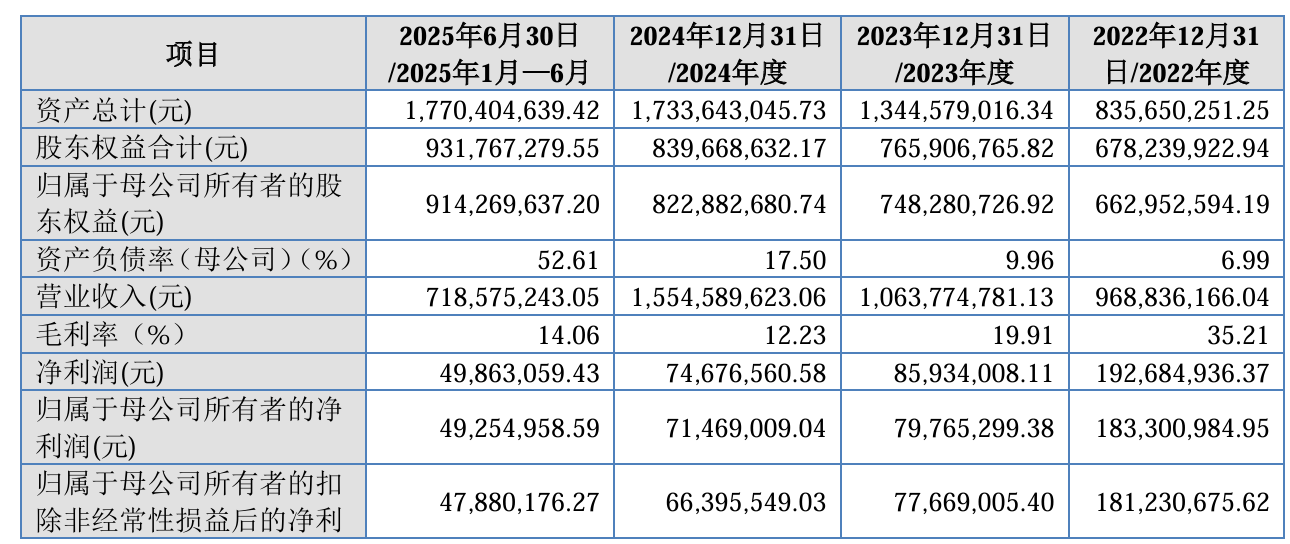 2022年至2024年及2025年上半年(下称“报告期”),公司营业收入分别为9.69亿元、10.64亿元、15.55亿元和7.19亿元;归母净利润分别为1.83亿元、7976.53万元、7146.90万元、4925.50万元,近两年度连续下滑。