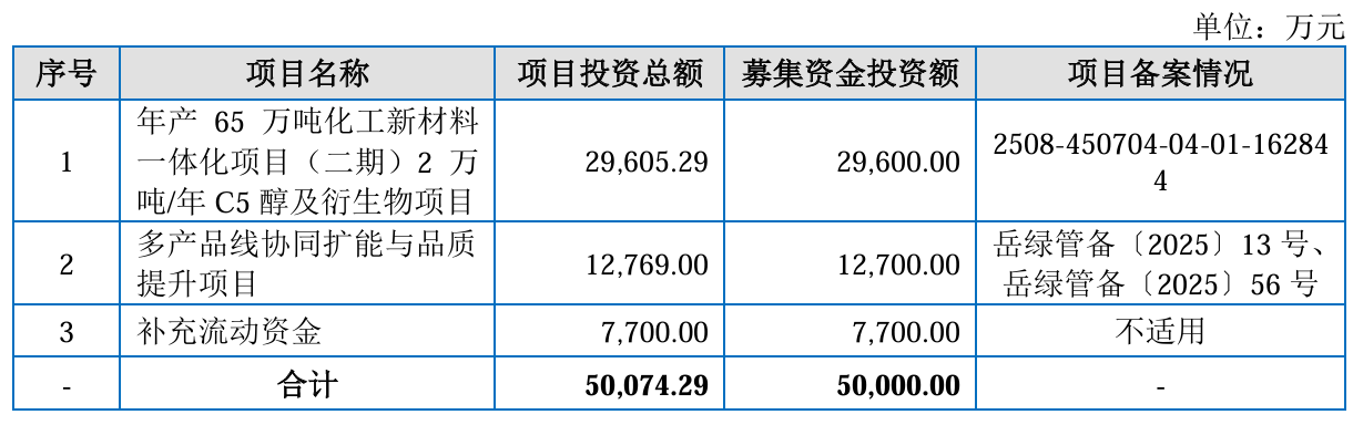 招股书显示,昌德科技本次IPO拟募集资金5亿元,分别用于年产65万吨化工新材料一体化项目(二期)2万吨/年C5醇及衍生物项目、多产品线协同扩能与品质提升项目和补充流动资金。