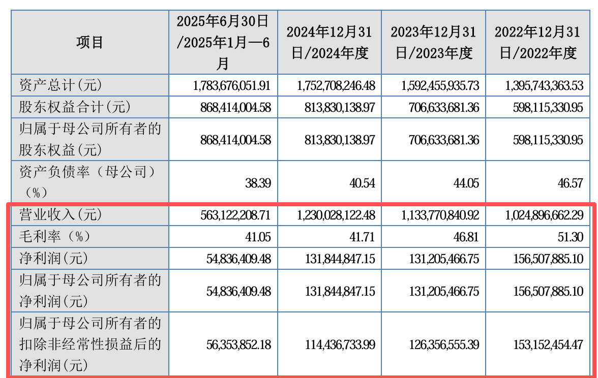 2022年至2024年及2025年上半年(下称“报告期”),济人药业营业收入分别为10.25亿元、11.34亿元、12.30亿元和5.63亿元;归母净利润分别为1.57亿元、1.31亿元、1.32亿元和5483.64万元。