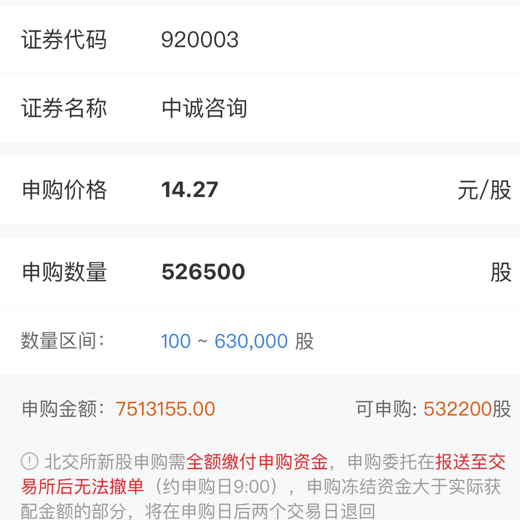 $中诚咨询(SZ920003)$ 按200股的资金申购 必中