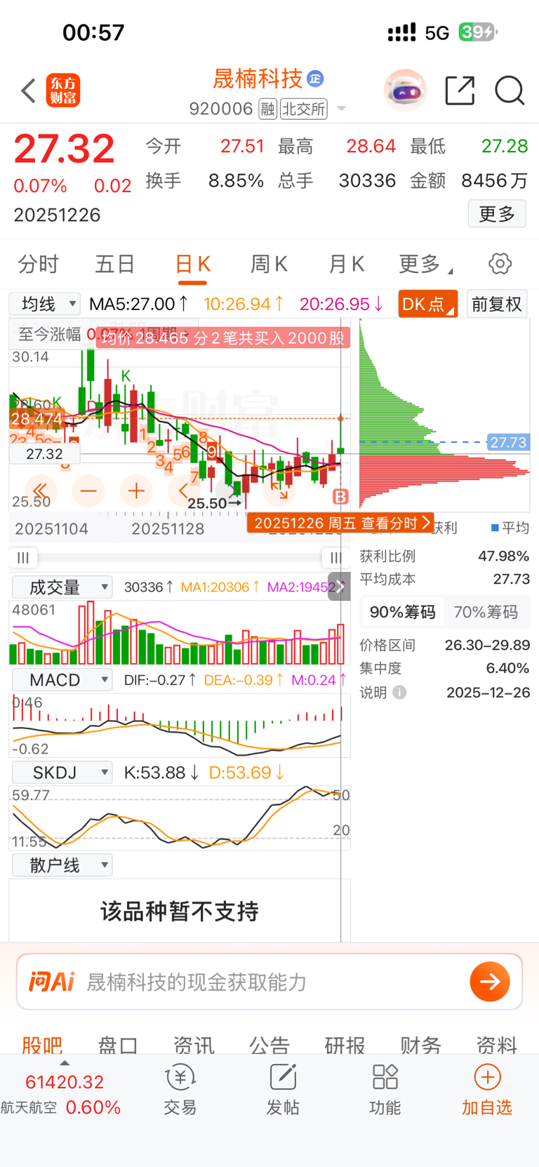看你有航天概念冲高放量支持了20手,想不到大盘放量你这杂毛还是差点果然不能玩杂毛