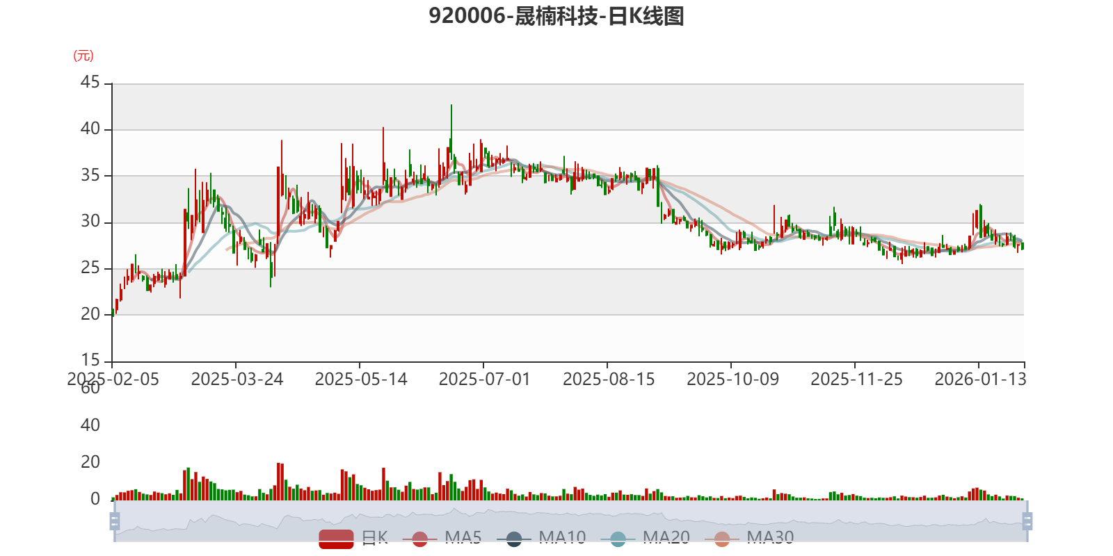 中证智能财讯晟楠科技(920006)1月28日晚间披露2025年度业绩预告,预计2025年归母净利润750万元至1100万元,上年同期亏损979.76万元。以1月28日收盘价计算,晟楠科技目前市盈率(TTM)约为222.76倍-326.72倍,市净率(LF)约7.56倍,市销率(TTM)约28.35倍。
