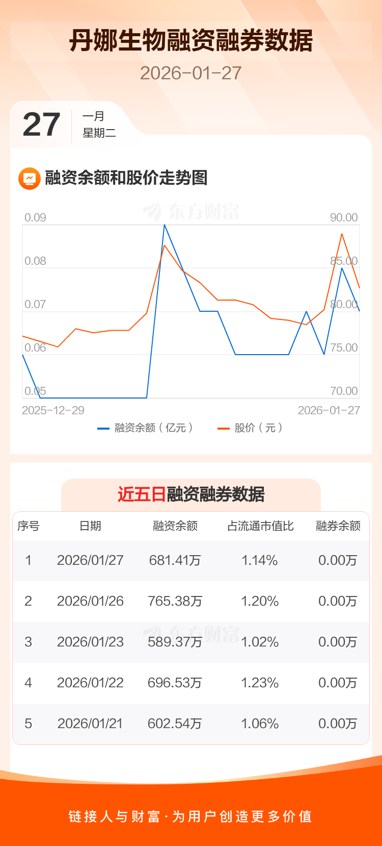 交易所最新数据显示,丹娜生物于2026年1月27日获融资买入151.63万元,融资偿还235.60万元,当日融资净偿还83.97万元。目前,该股融资余额681.41万,占流通市值比例为1.14%。
