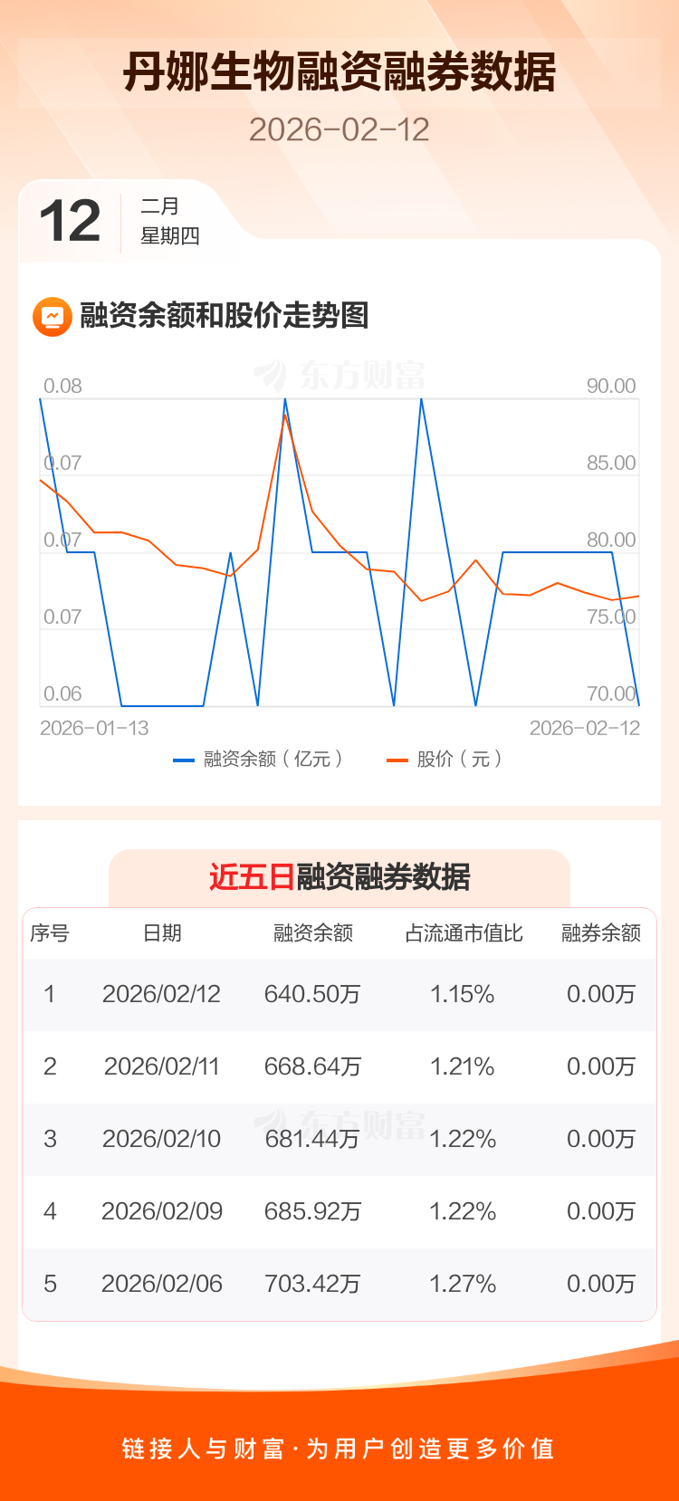 交易所最新数据显示,丹娜生物于2026年2月12日获融资买入7.70万元,融资偿还35.85万元,当日融资净偿还28.14万元。目前,该股融资余额640.50万,占流通市值比例为1.15%。